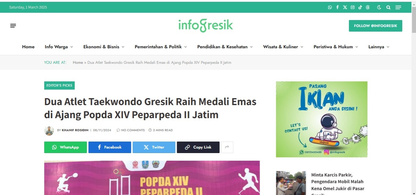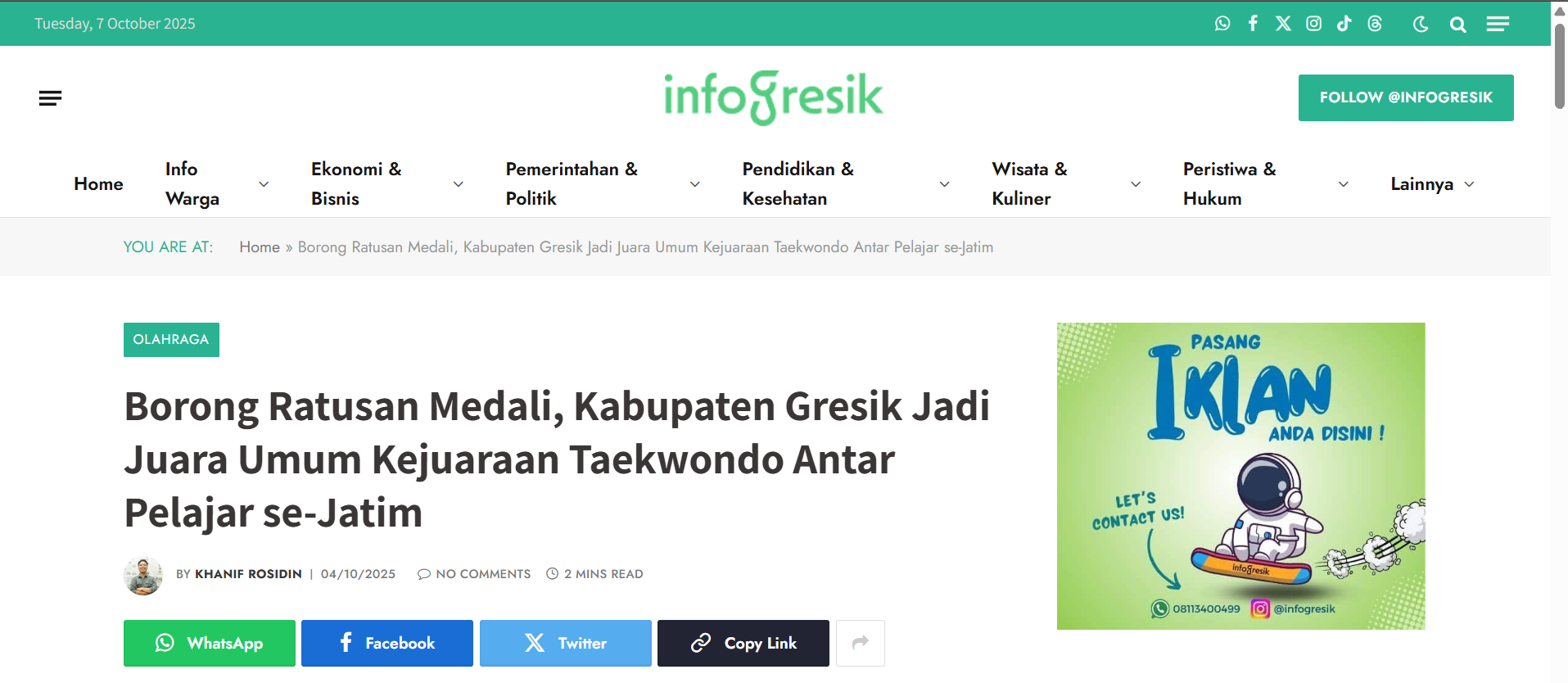 Prestasi membanggakan kembali ditorehkan oleh para atlet Taekwondo Kabupaten Gresik dalam ajang Pekan Olahraga Provinsi (PORPROV) Jawa Timur IX Tahun 2025. Bertanding dengan penuh semangat dan sportivitas, kontingen Taekwondo Gresik berhasil menyumbangkan total 6 medali, terdiri dari 1 medali perak dan 5 medali perunggu unt...
